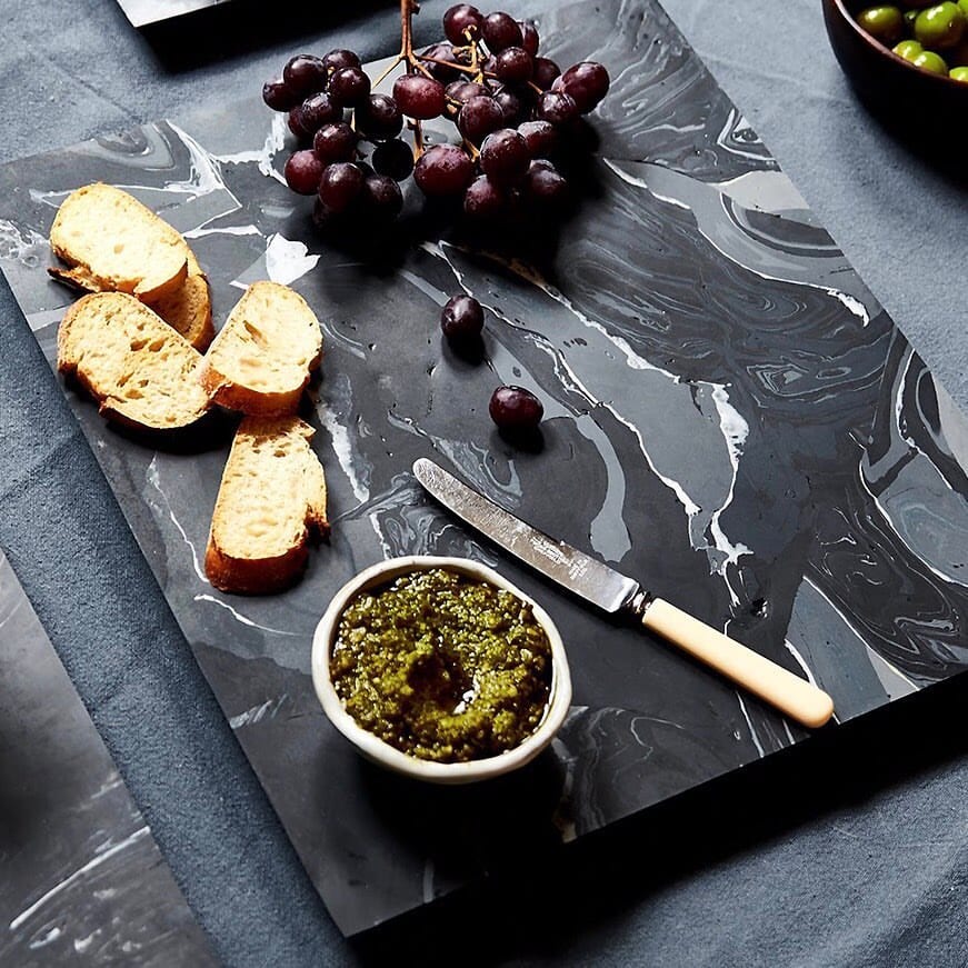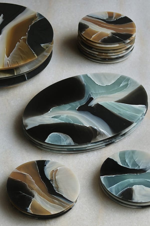 New this season, Weez and Merl’s latest collection of tortoiseshell marbled coasters and trays.